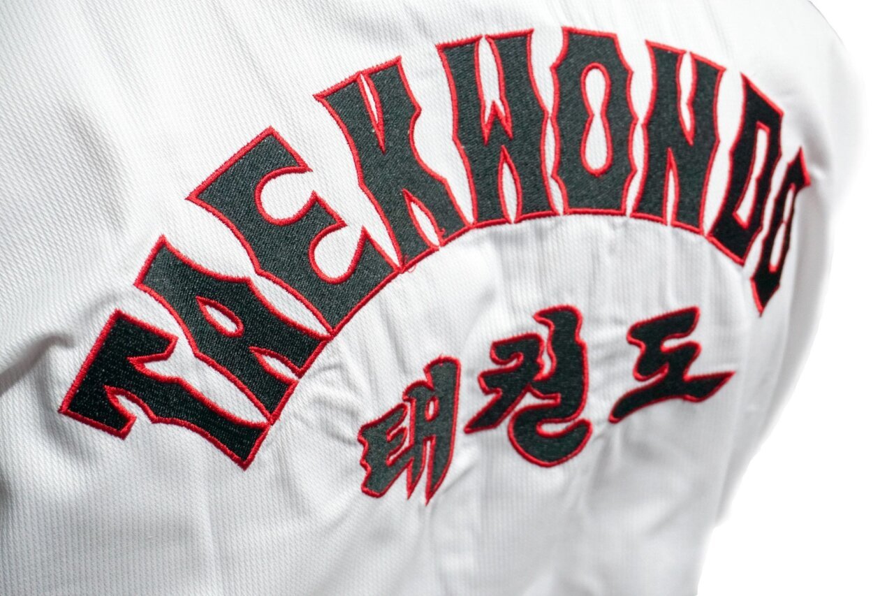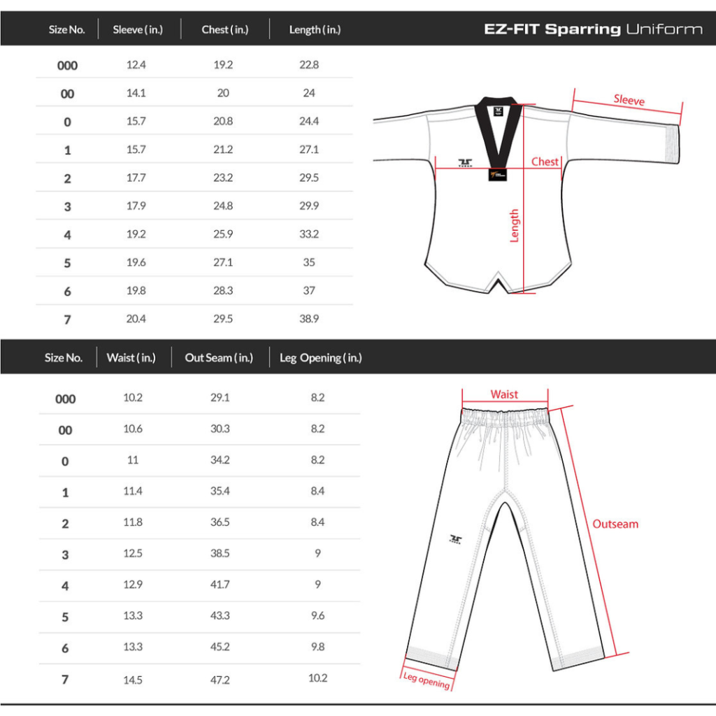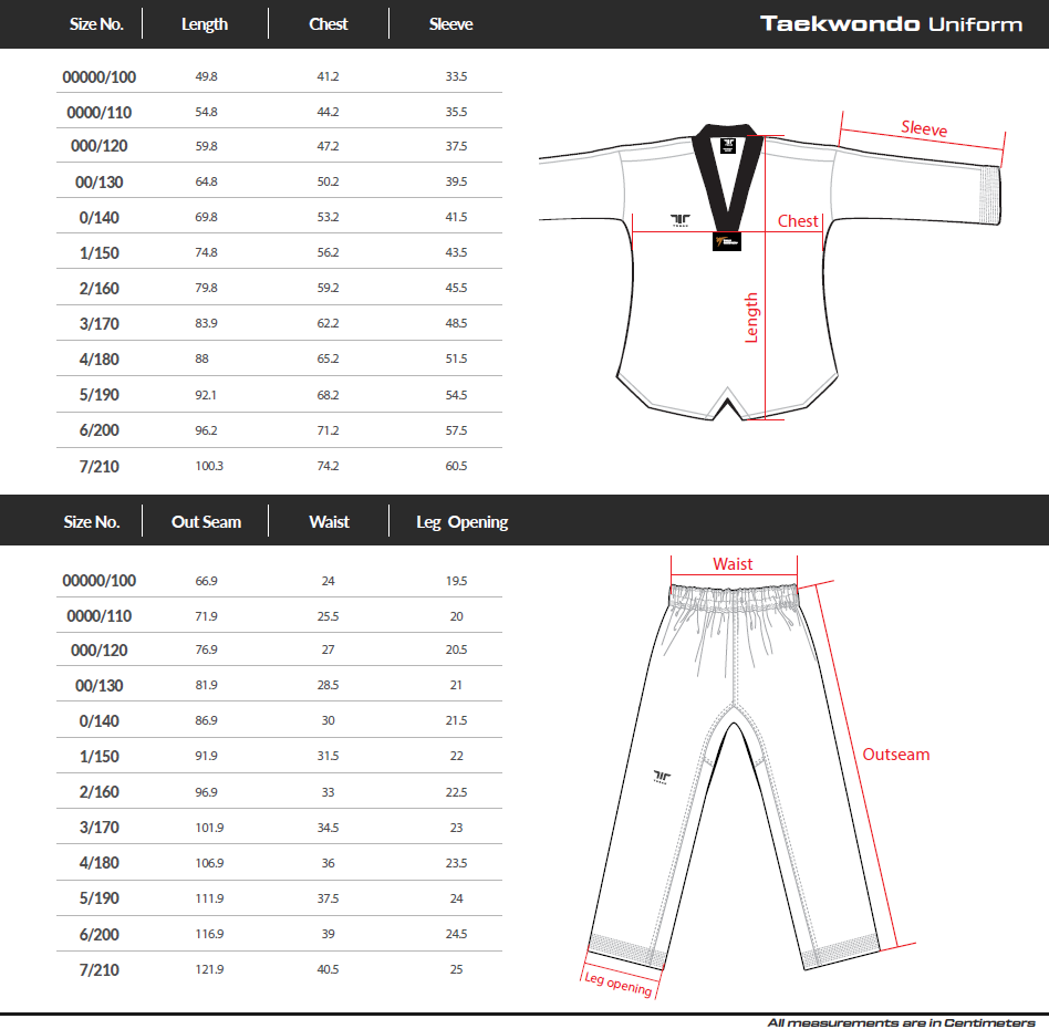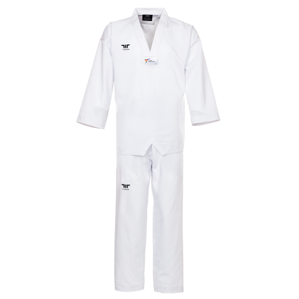 Extra stitched sleeves and trouser bottoms. Full length gusset. Complete with white belt. WTF approved Sizes: